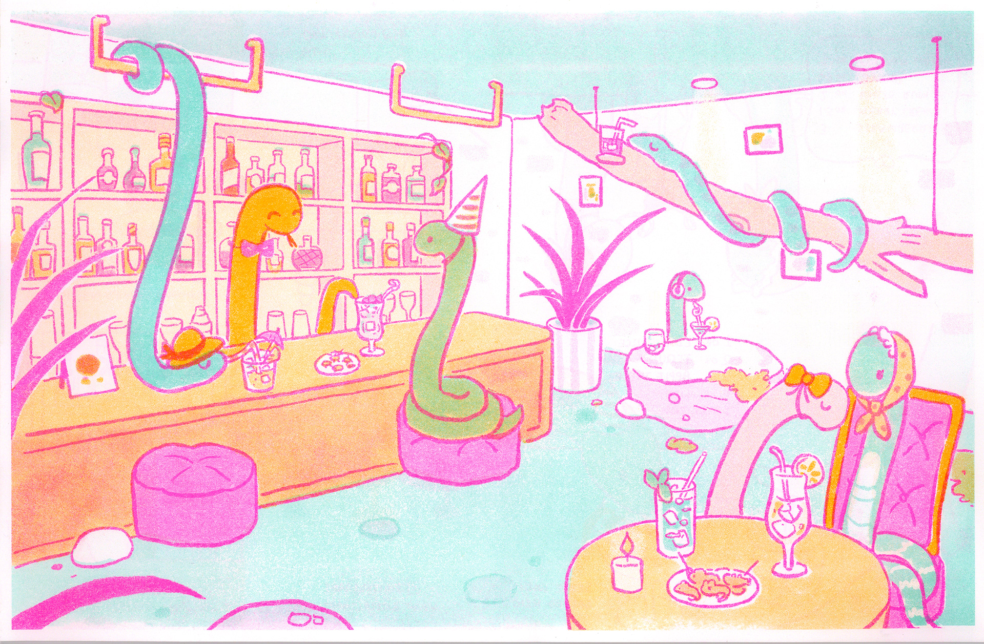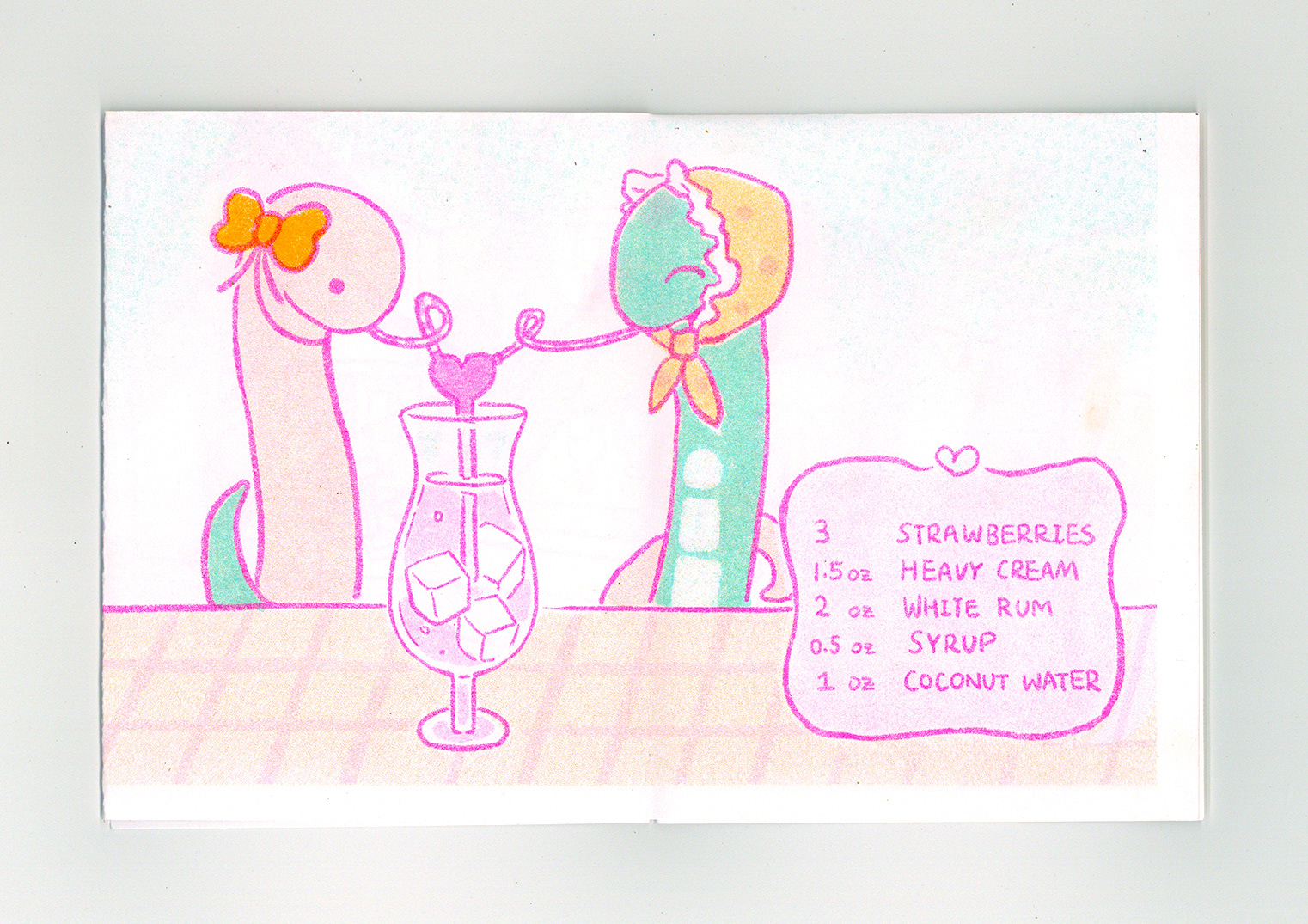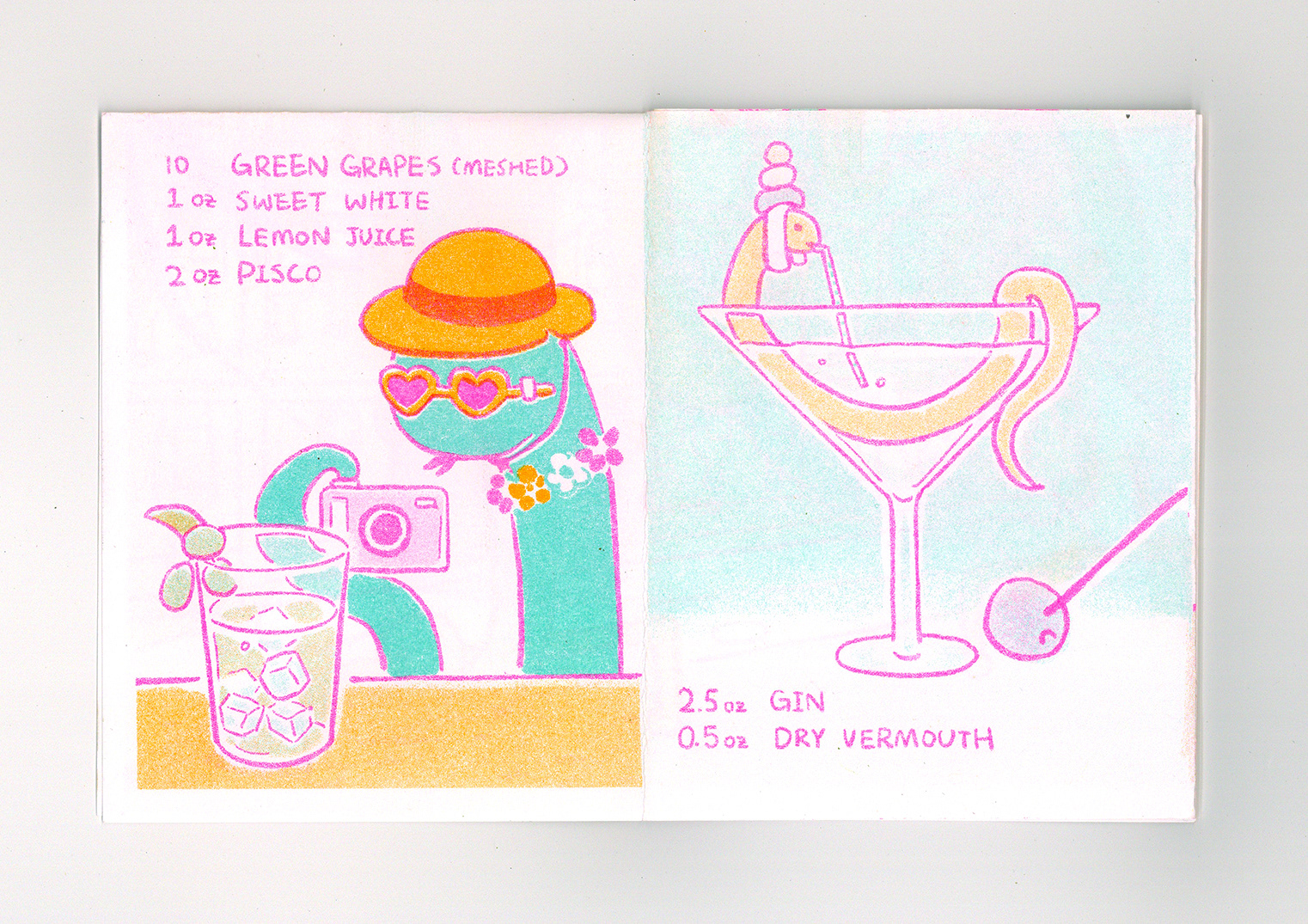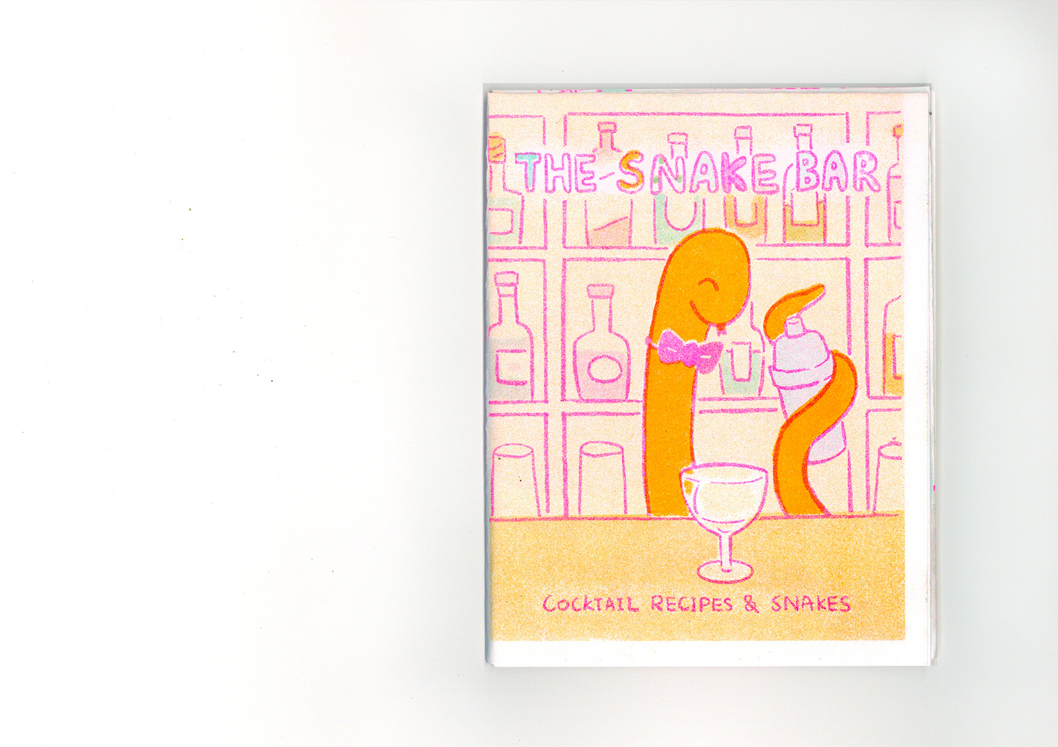 A risograph zine featuring snakes at bar and various cocktail recipes